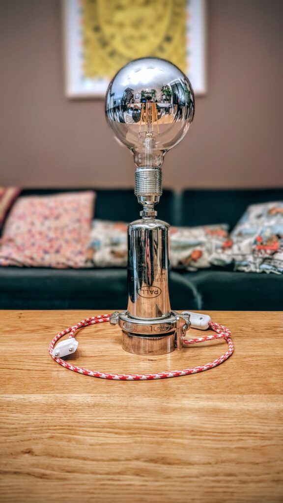 Lampe de table montée sur carter filtre. Dimensions : 15 x 15 x 40 cm.